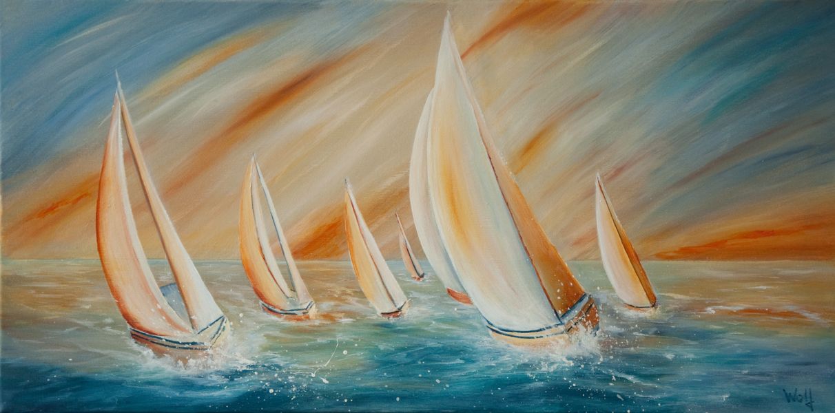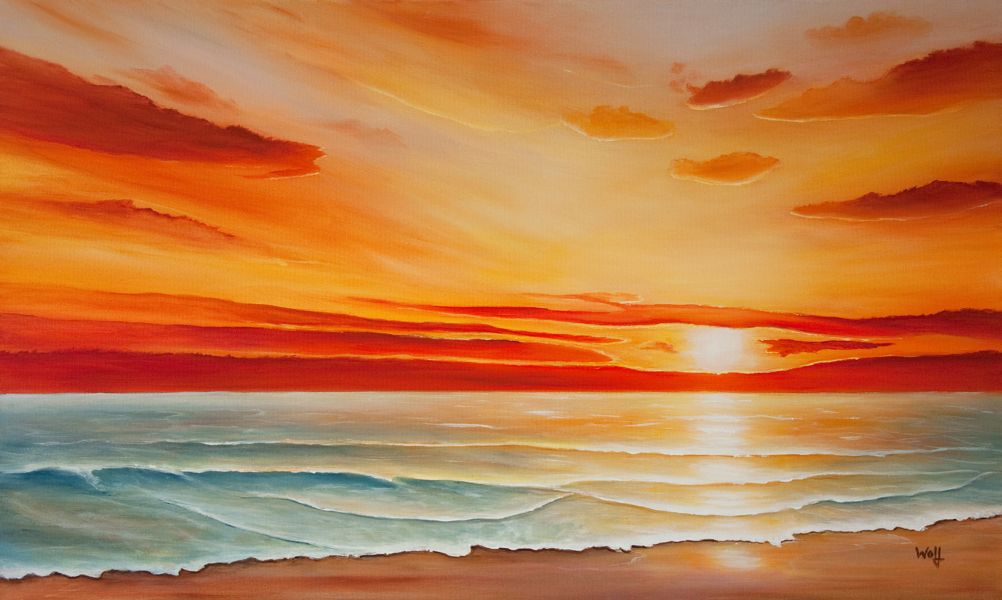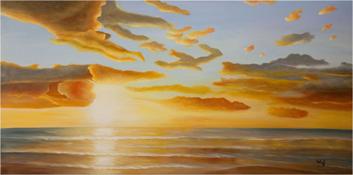 Wolkenglühen überm Meer bei einem schönen Sonnenuntergang. Acrylfarben auf Leinwand, 100 x 50 cm.